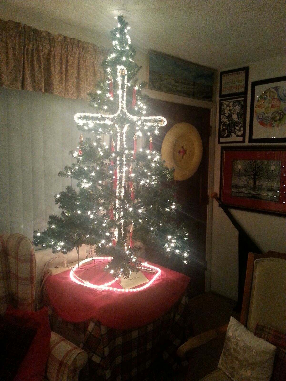 Another way we seek to celebrate Christmas to God’s glory is in relationship to the tree. Some years ago, it dawned on us that we could use the tree as a means to express more of God’s perspective than what we had been. The reason God the Son was born was to accomplish a special mission. He came to die so that mankind might live. This motivated us to figure out how we could use the Christmas tree to express that. With a little bit of thought, we figured out how we could make a cross (simple wooden slats), outlined with a rope light, almost as big as the tree, that could be inserted in among the branches and anchored to the trunk; this helps to communicate the message of God’s plan of Jesus’ birth, death and resurrection. One year we used a photo of that tree as part of our greeting card.