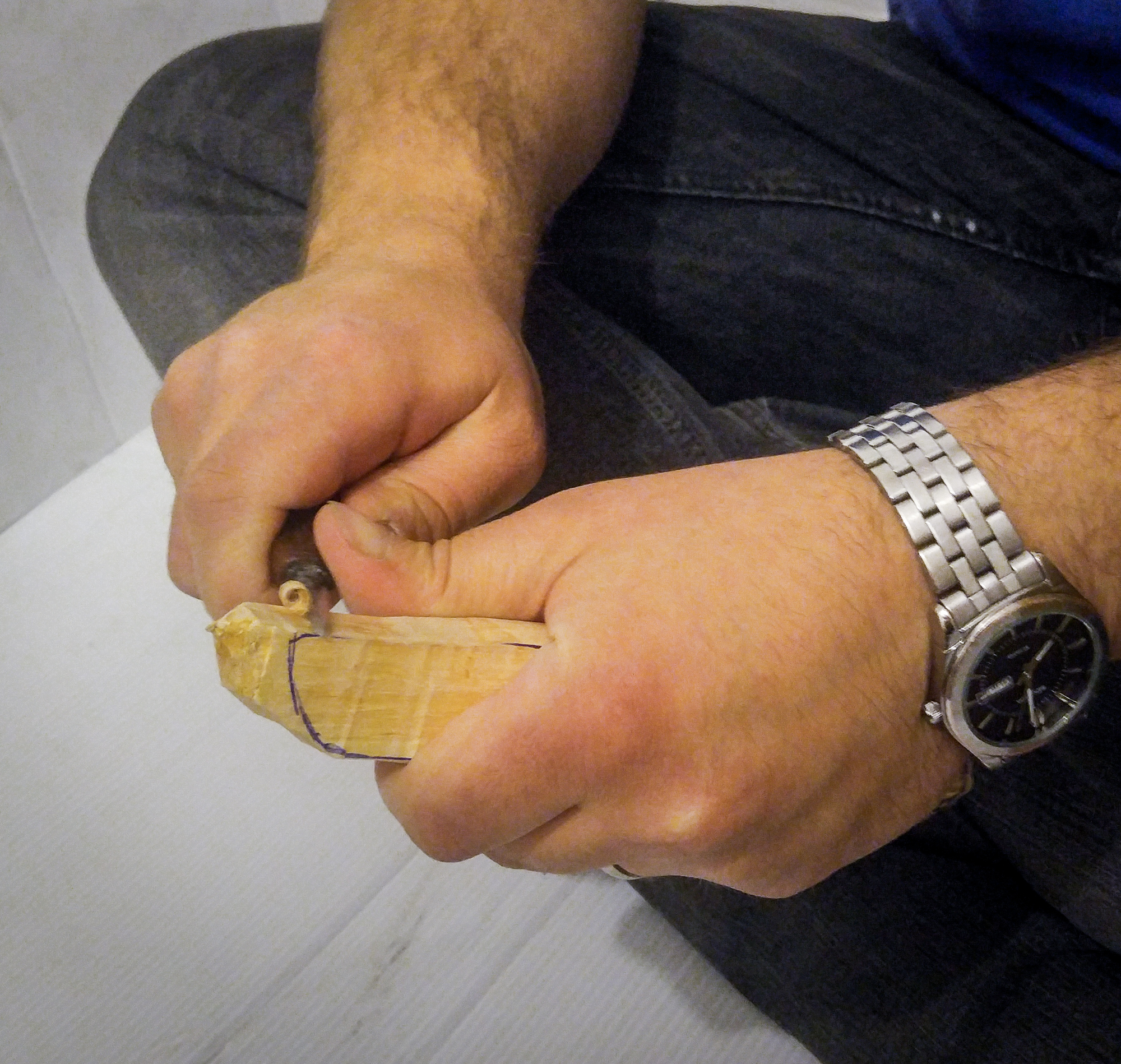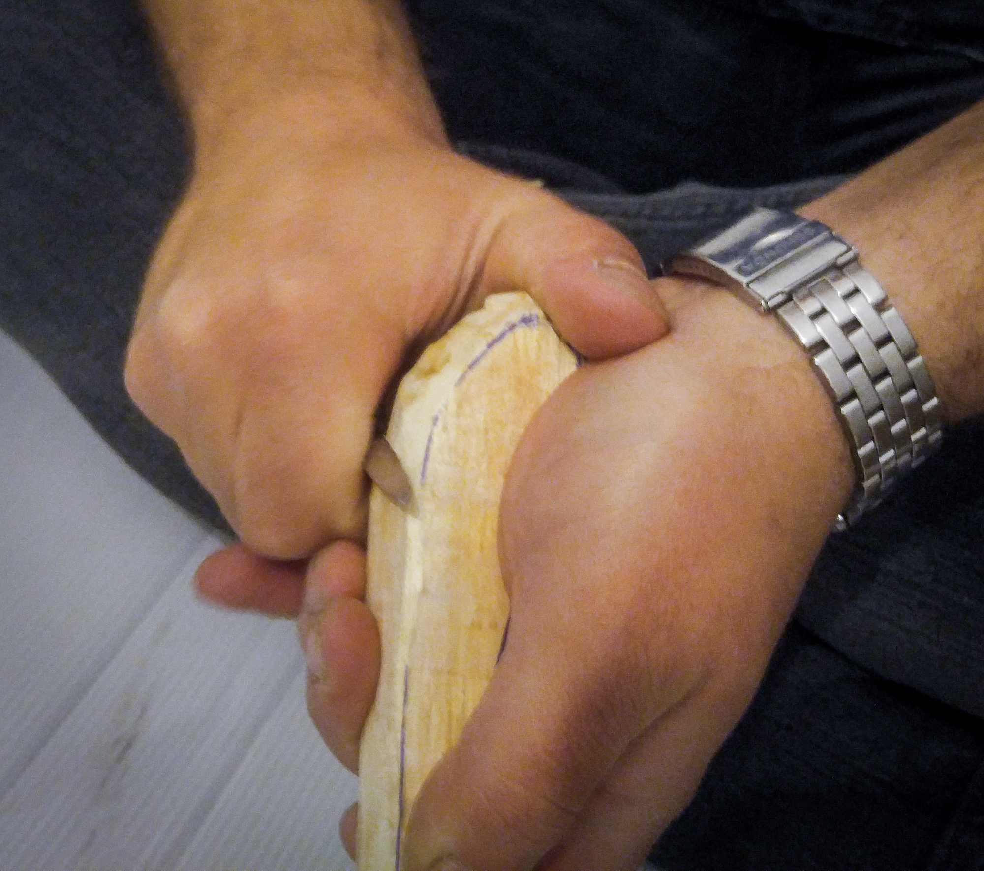 Keeping the knife in your dominant hand, hold it with the blade facing towards you, also hold the piece in this same hand. You can use your other hand to wrap around the piece to give extra stability. Now using slow and controlled motions, push the piece with your dominant hand’s thumb away from you and pull the knife with your fingers towards you. Imagine you are peeling a potato, it is the same cut as that. If you don’t feel comfortable doing this cut, you can continue using the push cut for this whole project.