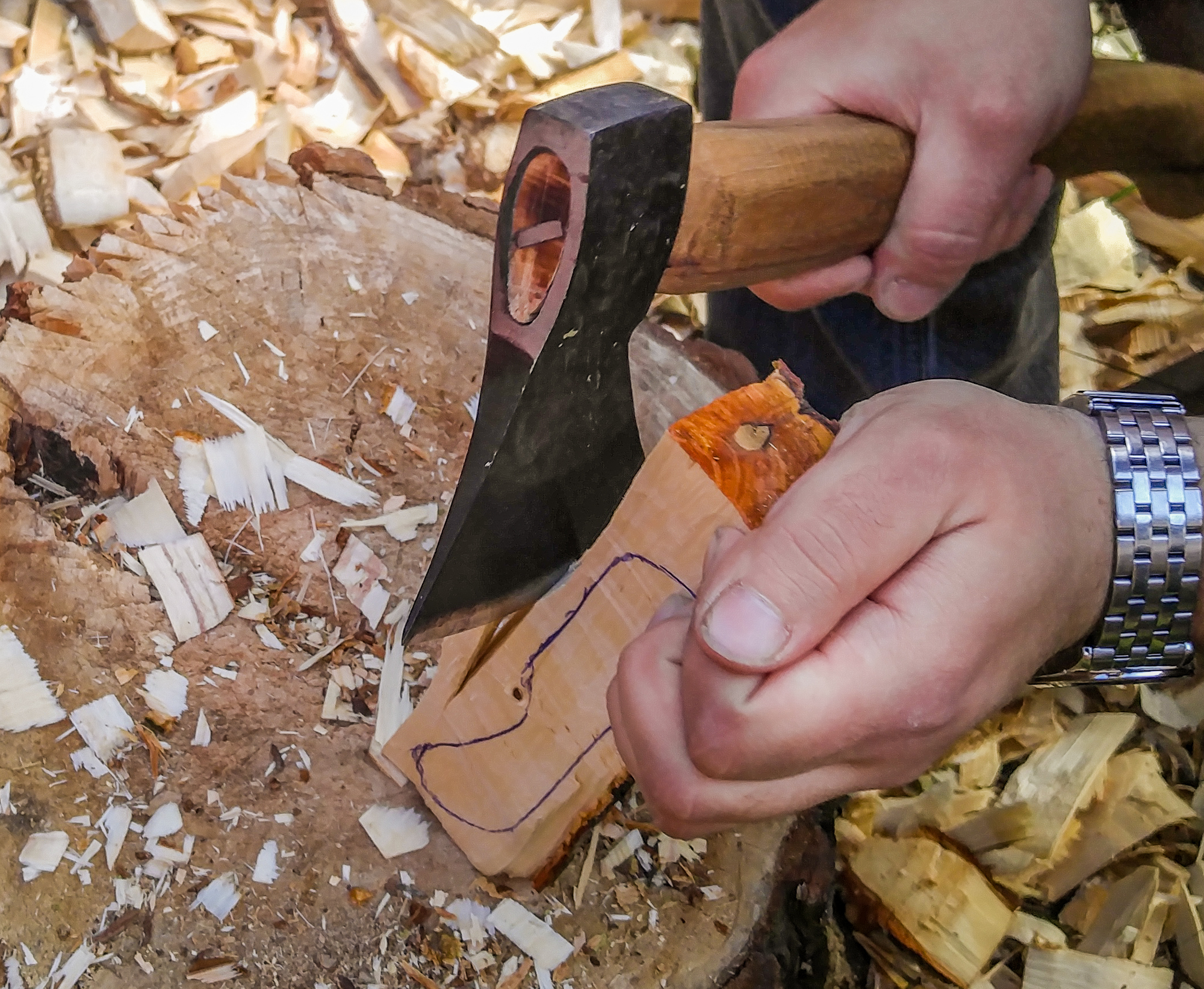 Let’s get chopping! Use your axe to start chopping away as much of the wood as you can, get as close to the lines of your spreader as you feel comfortable in doing.