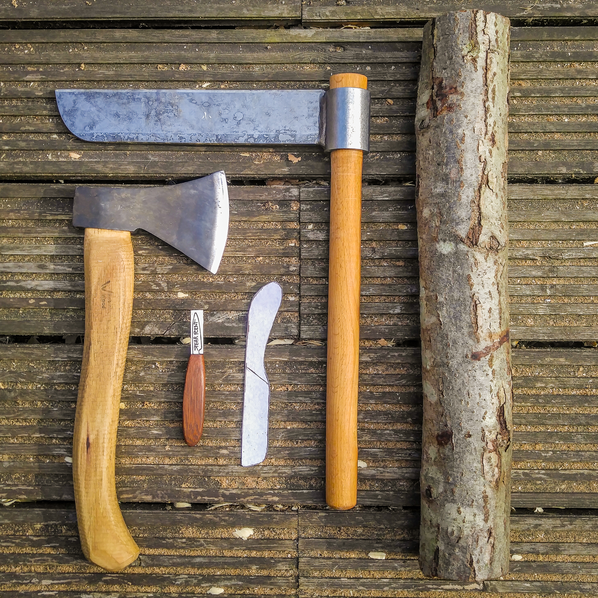 Gather your supplies. (Left to right: axe, knife, template, froe, wood.) Wood