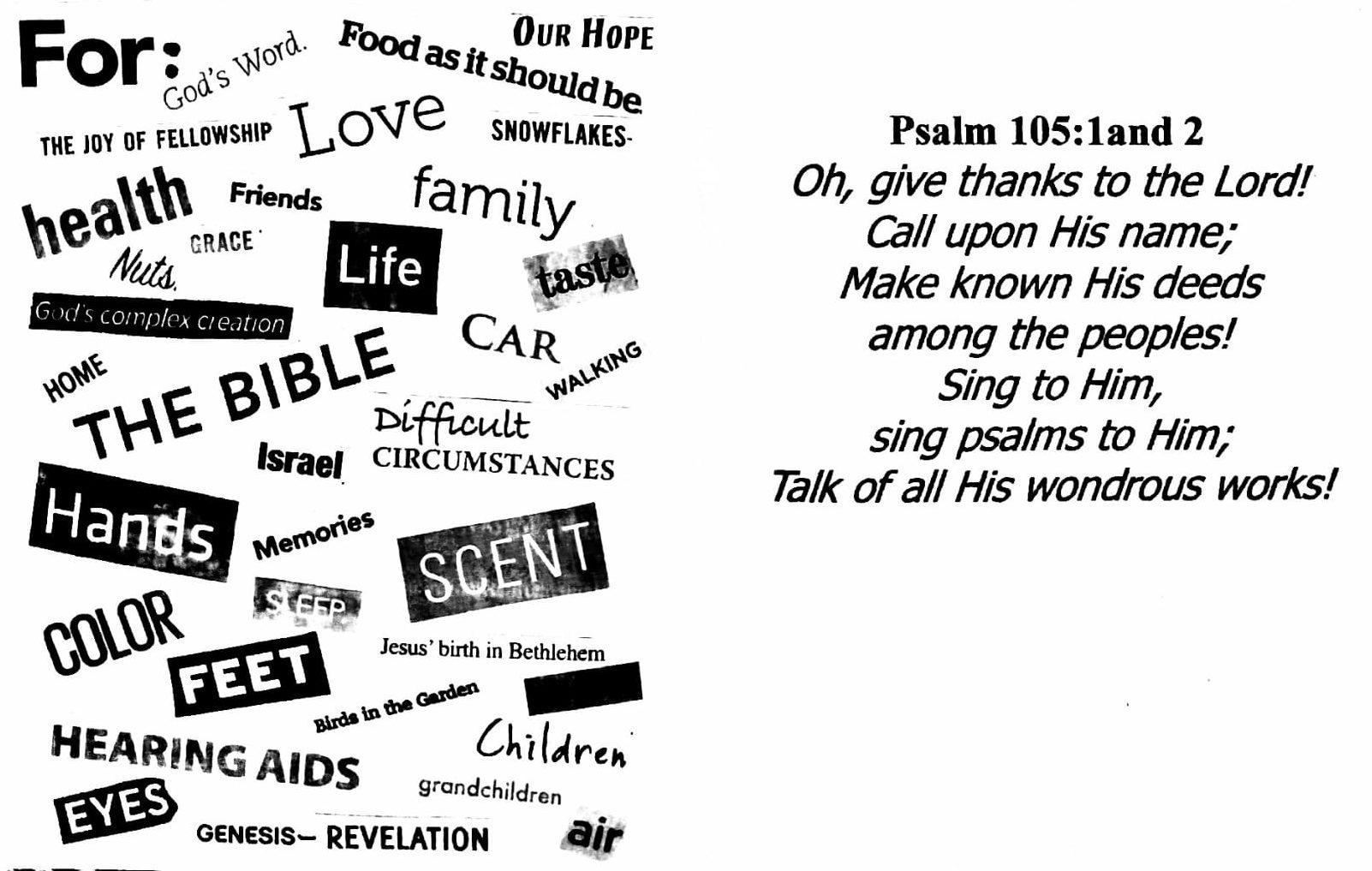 Every day of the year we receive from the Lord’s hand the blessing of sight, sound, touch, smell and taste. Every day of the year we receive His blessings in the form of light, the sun’s warmth, or clouds or rain or snow (well we don’t get that in the coastal regions of Southern California), and also evening and night (for rest and restorative sleep). These are all immaterial blessings – of the utmost worth.  Little wonder then, that our hearts delight in giving thanks to God for His bountiful blessings.